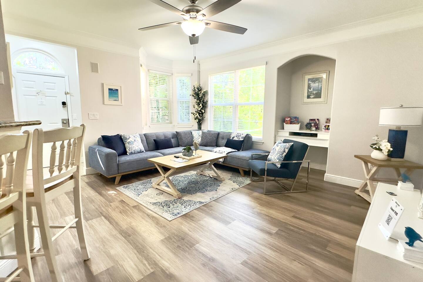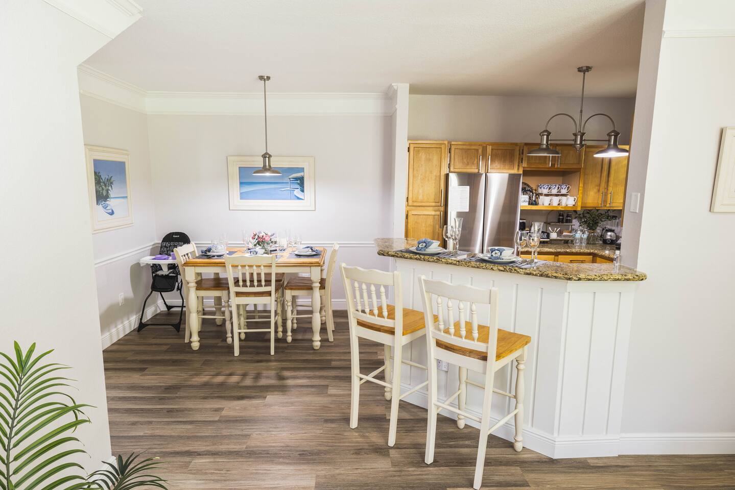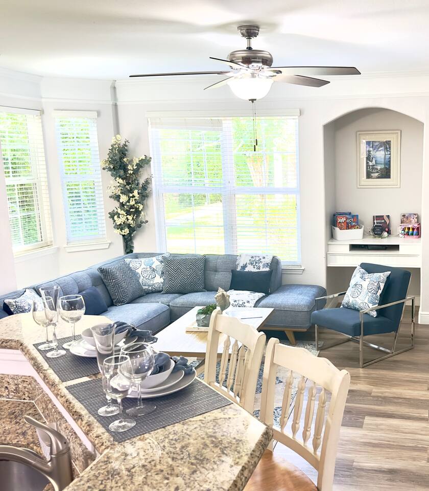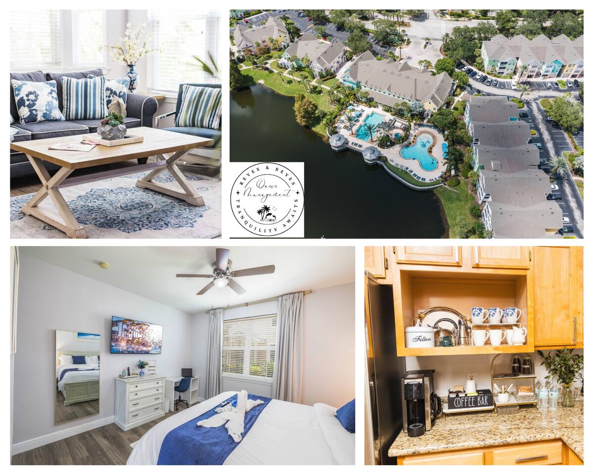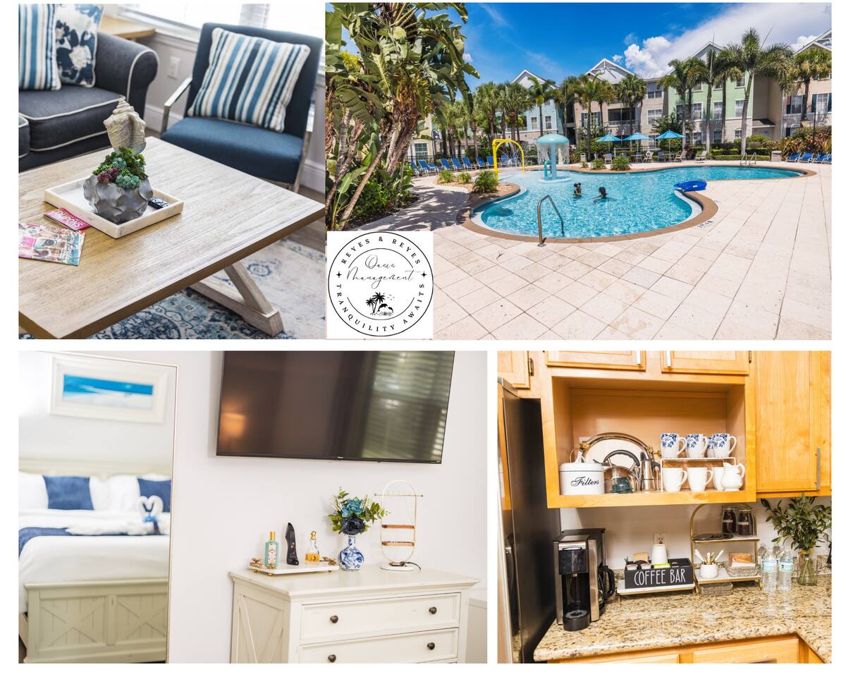 Immerse yourself in the relaxing and spacious, light-filled ambiance that flawlessly complements the stylish design of this Key West-style condo. From room to room, you'll discover an array of contemporary amenities thoughtfully placed to enhance your stay. The open-concept living area is the heart of this retreat, creating the perfect setting for fun gatherings that guarantee every moment spent here is enjoyable and memorable. As day turns to night and you seek a tranquil rest, you'll find it in two snug bedrooms, ensuring you wake up refreshed and ready to embark on your next thrilling Disney adventure. Finally, you'll be able to catch a breath of fresh air and feel the community's pulse by stepping outside on the charming front patio. It is the ideal spot to unwind with a morning coffee, bask in the sun, or savor a glass of wine while the sun sets. ★ LIVING ROOM ★ The moment you enter the condo, you'll be drawn by the comforts of the living room, setting the scene for countless memorable evenings. ✔ Cozy Sofa with Pillows and Throw Blankets ✔ Cozy Sofa Chair ✔ Smart TV with Roku ✔ Board Games ✔ Coffee Tables and Reading Lamps ★ KITCHEN & DINING ★ Stock up on fresh ingredients, arrange them on the spacious countertops and the kitchen bar, and use our culinary tools to craft delicious dishes. ✔ Stove ✔ Oven ✔ Microwave ✔ Toaster ✔ Blender ✔ Rice Cooker ✔ Coffee Maker (Complimentary Coffee Starter Kit) ✔ Hot Water Kettle ✔ Refrigerator/Freezer ✔ Dishwasher ✔ Sink - Hot & Cold Water ✔ Plates ✔ Glasses ✔ Silverware ✔ Pots & Pans What are you waiting for? Set the table and serve those delicious meals for a tasty homemade feast. ✔ Dining Table with Seating for 4 ✔ Kitchen Island with Seating for 2 ★ SLEEPING ARRANGEMENTS – 2 BEDROOMS ★ Move around the condo to discover two inviting bedrooms, each thoughtfully adorned to provide the ultimate relaxation following a thrilling day at entertaining adventure parks and our vibrant community. ♛ Master Bedroom: King-Size Bed, Workspace (Desk, Chair), Ensuite Bathroom ♛ Bedroom 2: Two Full-Size Beds, Toys Every bedroom comes furnished with a matching array of conveniences. ✔ Premium Mattresses, Pillows, Linens, and Sheets ✔ Smart TVs with Roku ✔ Walk-In Closets with Hangers and Shelves ✔ Dressers with Spacious Drawers ✔ Night Stands with Reading Lamps and USB Chargers ★ BATHROOMS ★ The accommodating condo boasts two full bathrooms stocked with clean towels and necessities, ensuring maximum comfort and convenience. ✔ Bathtub with a Shower ✔ Vanity ✔ Mirror ✔ Toilet ✔ Towels ✔ Hair Dryer ✔ Essential Toiletries ★ FRONT PATIO ★ Emerge onto the, providing an ideal spot for a refreshing drink during a slow afternoon. ✔ Cozy Seating Area Your unforgettable Central Florida retreat awaits – book your stay with us today and make cherished memories in this stylish oasis. Guest access The condo is exclusively yours, without interruption during your stay, so relax, unwind, and make yourself at home. Other than the already mentioned amenities, the home also features: ✔ High-Speed Wi-Fi ✔ Self Check-In (Keypad) ✔ Air Conditioning ✔ Heating ✔ Children's Amenities (Pack' n Play/Travel Crib, High Chair) ✔ Laundry Closet (Washer/Dryer, Iron/Board, Detergent) This condo is located within the esteemed Runaway Beach Club, offering a wide range of exceptional amenities you can use during your visit. ✔ Three Heated Swimming Pools with Sun Lounges and Parasols ✔ Two Water Park-Style Pools with Slides ✔ Two Hot Tubs ✔ Fitness Center ✔ 18-hole Mini Golf ✔ Sports Courts (Sand Volleyball, Basketball) ✔ BBQ Grill Area ✔ Waterfront Sundeck ✔ Marketplace with Starbucks and Restaurant ✔ Business Center ✔ Spacious Lobby ✔ Gated Free Parking Other things to note ★ CLEANING & SANITIZATION ★ Health, safety, and well-being of our guests are of utmost importance. For this reason, we use a thorough cleaning process after each check-out. ★ NO PETS ALLOWED ★ We love those little (and not so little) furry bundles of joy. Sadly, our home is not suitable for accommodating them. ★ NO SMOKING INSIDE ★ Please refrain from smoking inside the condo! Any smoking evidence will result in a fee for odor removal and furniture cleaning. ★ NO PARTIES/EVENTS ★ We kindly ask you to treat our home as your own to preserve its pristine condition for future guests and your return visits. Thank you very much. We look forward to hosting you! Interaction with guests We will be accessible to guests via phone, text, or the Airbnb app. Expect a quick and prompt response. We give our guests space but are available for every inquiry. Contact us now so we can begin arranging your perfect vacation! The neighborhood Overview The condo is a part of the high-end Runaway Beach Club, a premier gated community nestled in the heart of Kissimmee, Florida, boasting an enviable location that places you within minutes of Central Florida's most popular destinations. Just a short 10-minute drive away, Walt Disney World Resort awaits with its magical parks and attractions. From the enchantment of Magic Kingdom to the futuristic thrills of EPCOT, the cinematic wonders of Hollywood Studios, and the wild adventures of Animal Kingdom, Disney's iconic experiences are right at your doorstep. A quick 15-minute drive will take you to SeaWorld Orlando, where you can immerse yourself in the wonders of marine life. Enjoy spectacular shows, thrilling rides, and up-close animal encounters at this world-renowned aquatic theme park. Universal Orlando Resort, including the exciting Universal Studios Florida, the adventurous Islands of Adventure, and the enchanting Wizarding World of Harry Potter, is only a 20-minute drive from Runaway Beach Club. Prepare for a day of exhilarating rides, incredible shows, and unforgettable experiences. Runaway Beach Club is conveniently located near various shopping and di